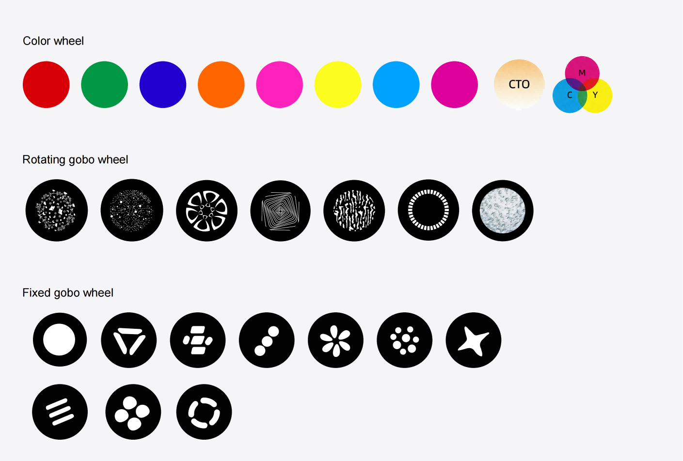 • Rotating gobo wheel: 7 pluggable glass gobos, each gobo can rotate independently in both directions